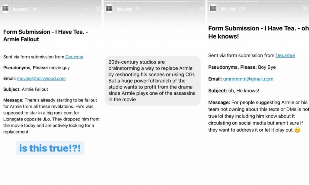 According to one source, “20th Century studios are brainstorming a way to replace Armie by reshooting his scenes or using CGI,” however, “a powerful branch of the studio wants to profit from the drama.”