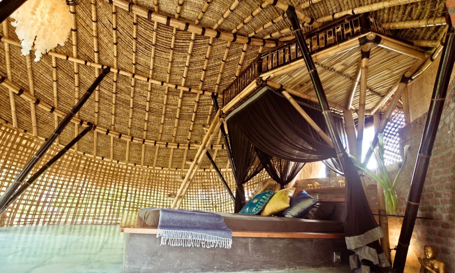 Nestled in rice fields down a quiet footpath, this bamboo cottage is only a convenient five-minute walk to central Ubud. Made entirely from bamboo and with open air basket weave walls and a mini loft, this one-bedroom cottage provides a truly authentic Balinese experience.