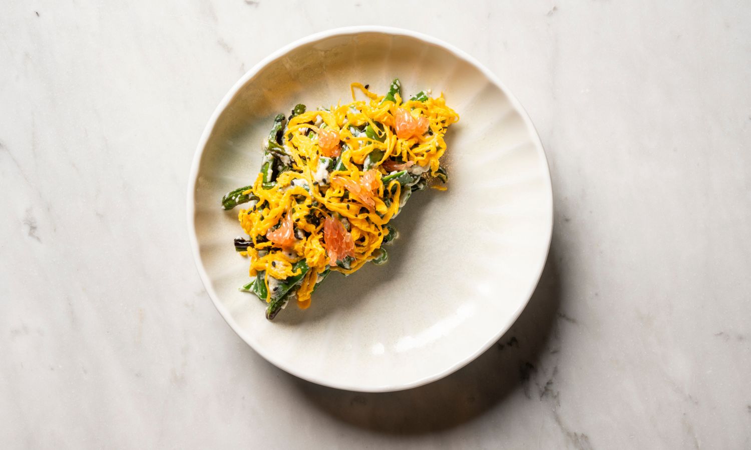 “At Best, we grill the mandarins whole, unpeeled straight on the flames, which make it plump with extremely juicy segments that we carve by order, and warm up with slow-grilled radicchio dressed with olive oil and oloroso or cava vinegar,” she says. “This is all dress with ajoblanco, an ice-cold almond and garlic soup.”