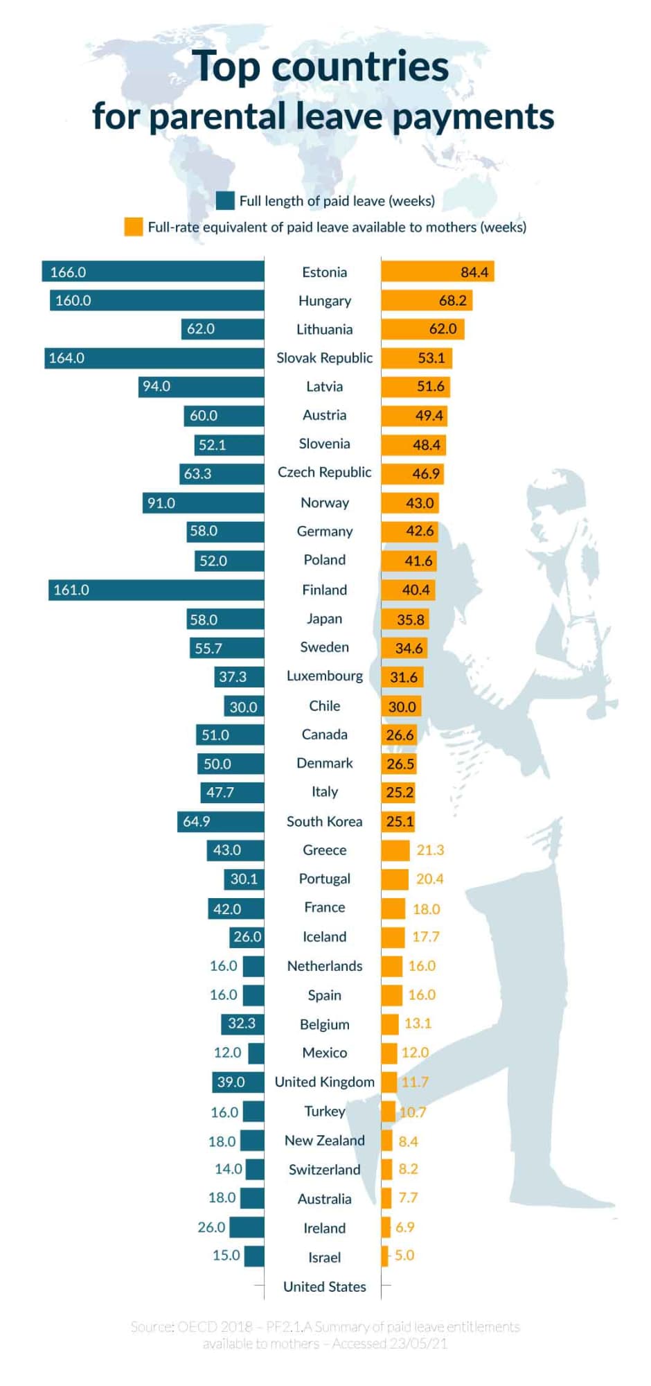 Conversely, US parents again get the rough end of the stick with no paid parental leave entitlements. This slightly improves with Israel (second last) and Ireland (third last), offering 15 and 26 weeks of paid leave to their parents respectively.
