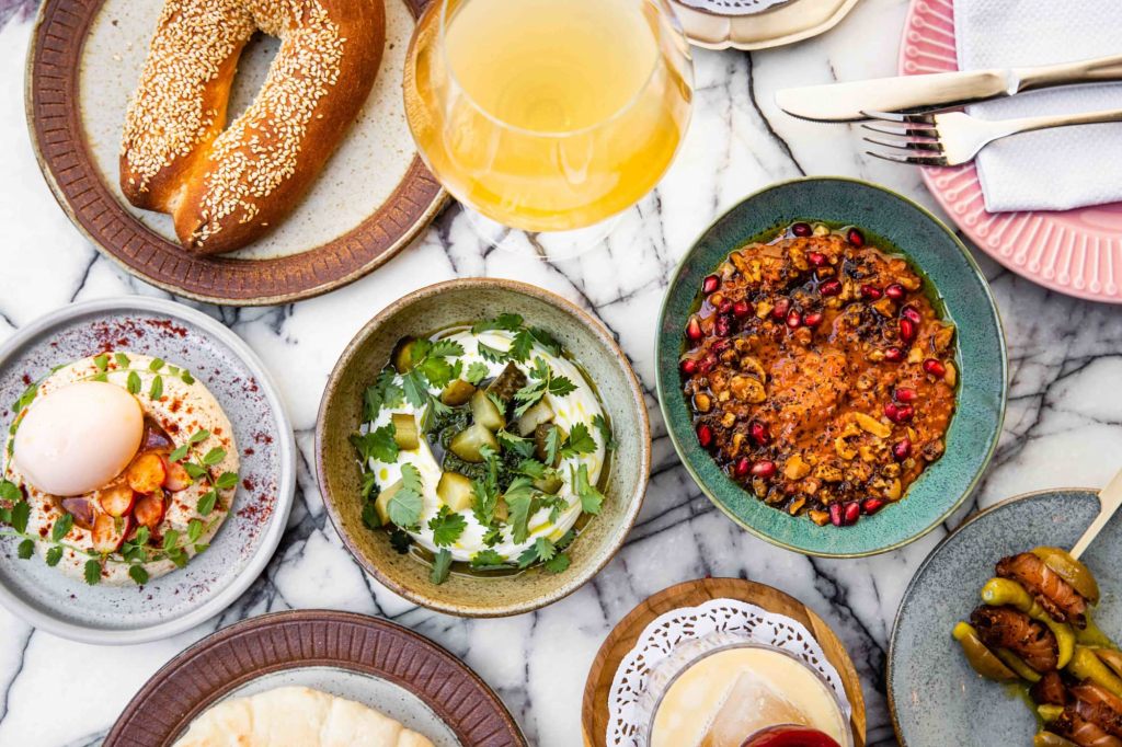The food: The food reflects the Diaspora of Ashkenazi and Sephardic Jewish favourites, including meze and flatbread, delicious dips from hummus to charred eggplant. Dishes are meant to be shared, but you might want to order two of the beef kibbeh with almond cream and sumac–one each. Other shareable plates include the whole roast cauliflower smothered in halloumi, Zaatar and honey. The lamb shoulder tagine is a crowd favourite as is the ice cream baklava sandwich.