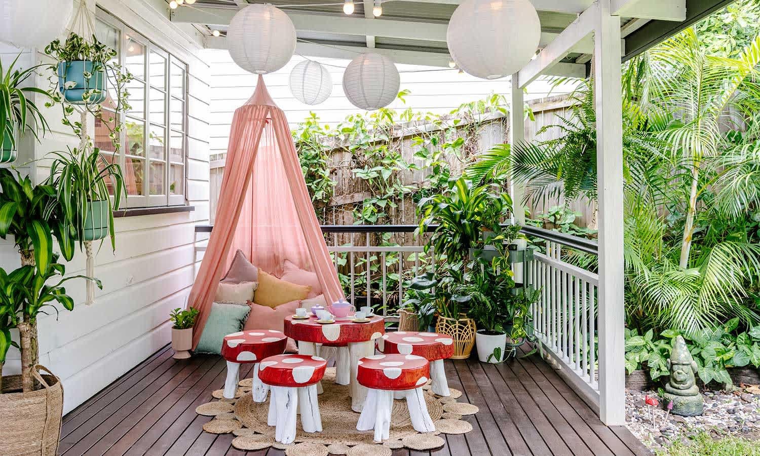 And when they’re all tuckered out, they can hit the hay in the girls’ bedroom, equipped with two single beds, fitting with custom stained-glass windows, colourful hanging lanterns and a hand-crafted watermelon rug.