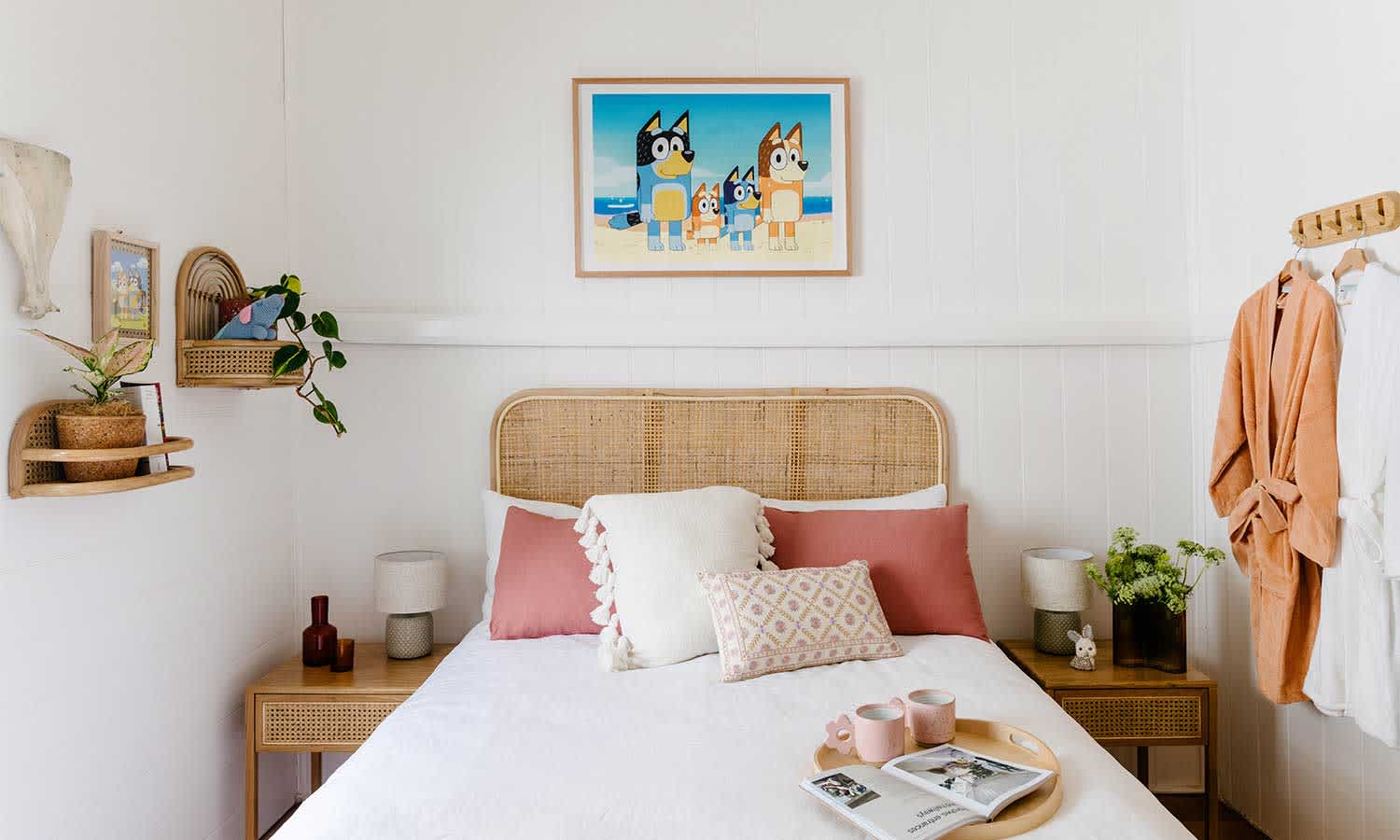 Meanwhile, after some vinos in the yard, coupled with Brisbane’s balmy evening weather, parents can retreat to Chilli and Bandit’s airy, plant-filled master bedroom, kitted out with a queen-sized bed, rattan furnishings and calming, neutral hues.