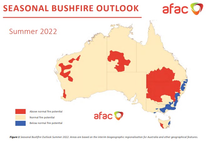 “Above normal” fire potential is expected in central parts of the country, including WA, southern Queensland, and inland NSW. This is also the case for western Tasmania.