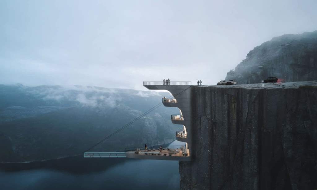 This hotel will really test your height fears. Designed to be built into Norway’s renowned cliff Preikestolen, it has a rooftop entrance and a stretched terrace, complete with a hanging infinity pool with a glass floor. Could you swim in a pool that makes you feel suspended in mid-air, off the side of a cliff? Our bodies are tingling just looking at the render. It’s visually remarkable and incredibly ballsy.