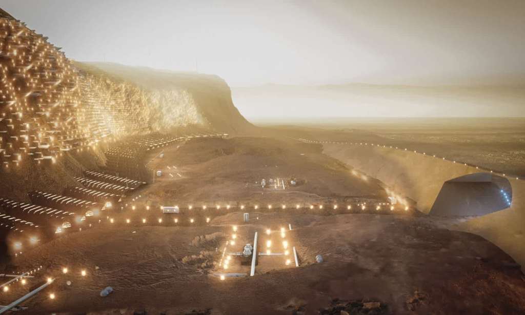 The vertical city, which would aim to house 250,000 people, is designed to be embedded into the side of a cliff, built using materials available on Mars. A system of interconnected tunnels would be bored into the Martian rock on Mars, with some tunnels projecting from the cliff face to let light into the city and the area at the top of the cliff would be used for growing food.