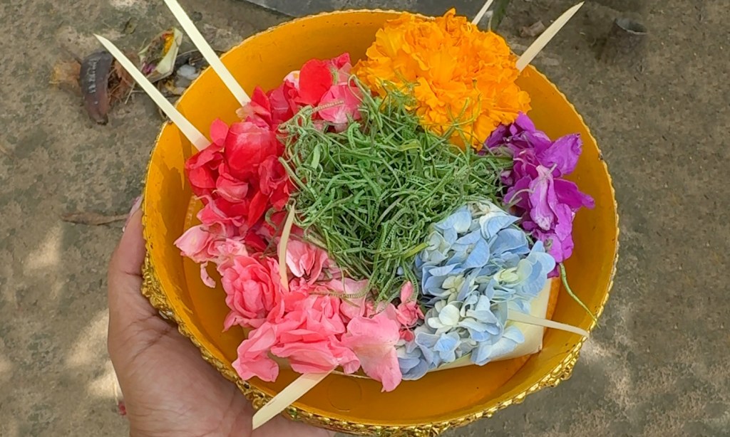 On Nyepi morning, we were lucky enough to make our own offerings, also known as “canang sari”. If you’ve been to Bali before, you’ve likely seen these placed at the front of homes, temples and other businesses. These offerings are made daily and made up of things like flowers, rice, incense, sweets, fruits, spices and sometimes even a cigarette. We wove our own baskets with coconut leaves — using bamboo needles — and placed these offerings at the temple in our individual villas. Making these myself gave me insight into the meaning behind each flower and each grain, and I was able to stop and appreciate the sentiment every time.