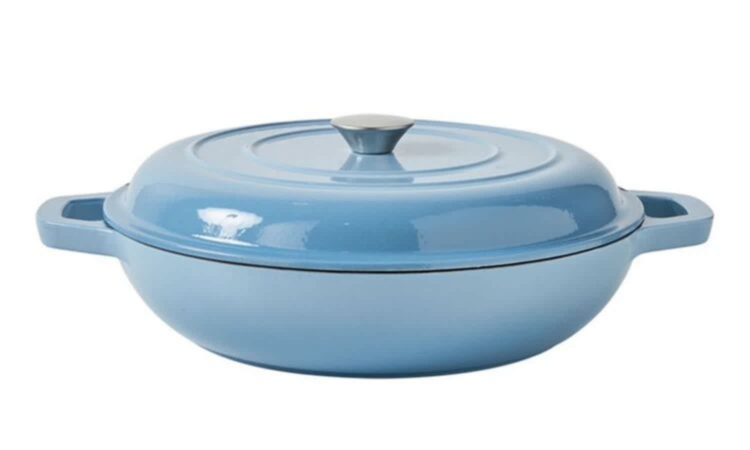 So, what’s on offer? Well, the range features roughly 35 items, including skillets, casserole dishes, braisers, roasters and fry pans that come in various sizes and colours like gradient blue, a beautiful lilac and a bold red. It starts at $12.95 and goes up to about $79.97 (sale prices).