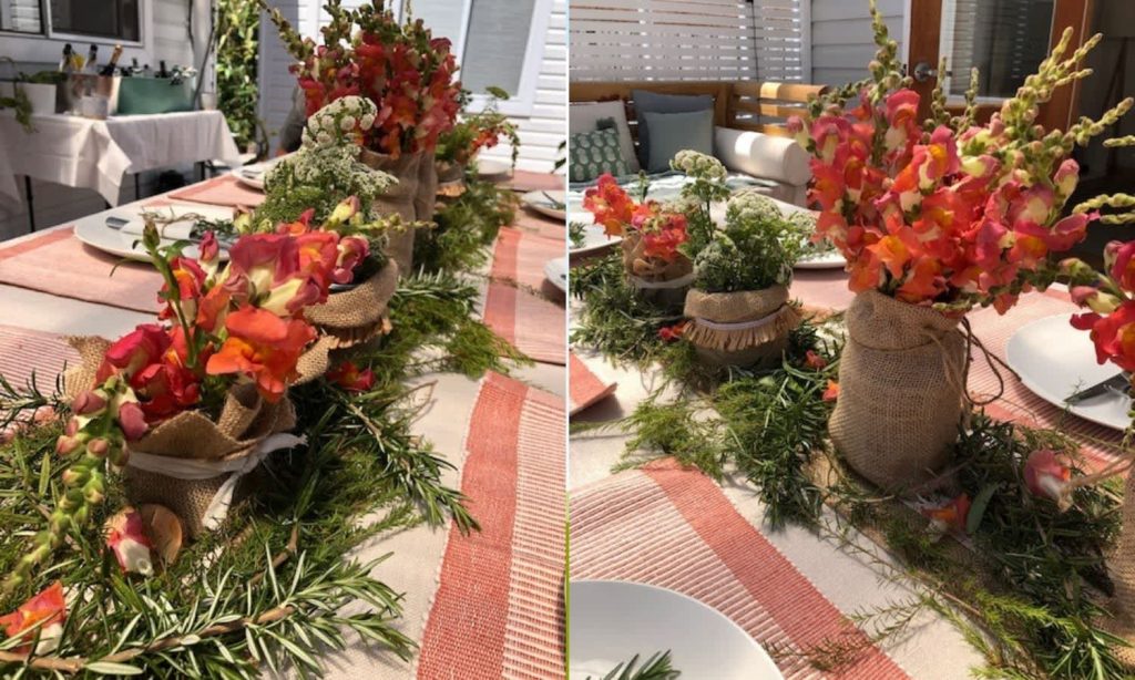 Even it’s a party for two, you can still make it special with a few simple touches. When my partner and I were in lockdown, I made a little backyard picnic for us with bouquets of flowers picked from our yard and tea light candles in jars. It made such a difference and really took us out of our COVID gloom for an afternoon.
