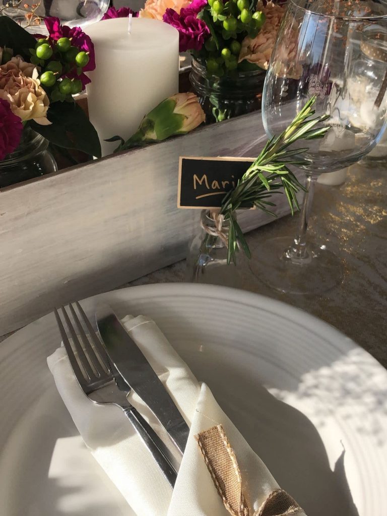 One Thanksgiving, I bought little ink bottles and filled them with sprigs of rosemary and then found little clip-on blackboards to write my guests’ names on. These were so handy as they then doubled as tags for the stems of everyone’s wine glasses, so we made sure we were drinking from the right ones all night.