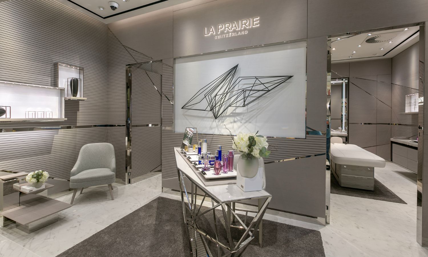 Once inside the spa, I felt worlds away from the hustle of the airport outside. I was offered a choice of Champagne or still or sparkling water. I went with sparkling, which I sipped as I was given an overview of La Prairie’s history and the Swiss brand’s products.