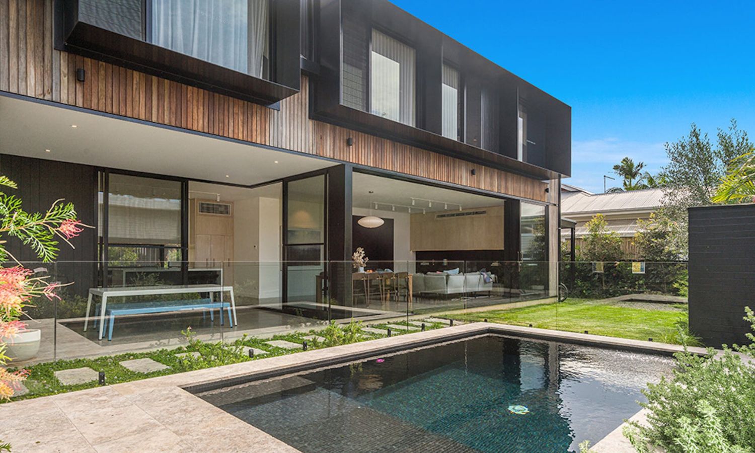 This four-bed home in Byron features a beautiful indoor-outdoor flow with an open-plan design and tons of natural light so you can take in the lush surroundings even while you’re inside it. All bedrooms have oak flooring, while the kitchen and lounge have polished concrete. Outside, you’ll find an alfresco area, manicured gardens and an in-ground pool heated from May to October.