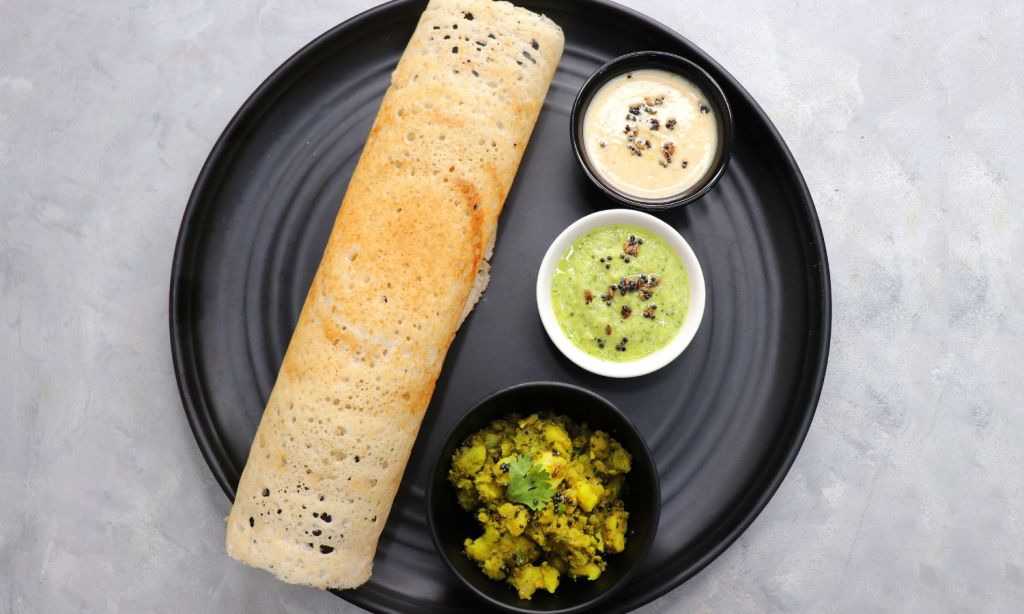 Originating in South India, masala dosa has two parts: yellow spiced potato mash stuffed inside dosa that looks like a rolled poster. The dosa is made of fermented rice and lentils, forming what looks like a crepe.