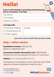 Another example of this is the creation of printable postcards that you can share with your neighbours. Political activist group GetUp recently created a downloadable #ViralKindness postcard. If you have the time and capacity to provide help to those around you, fill in the card and pop in your neighbours letterbox. Click here to download your own postcard.
