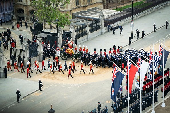 A Royal procession made up of members of the Royal Navy and Royal Marines carried the coffin from Westminster Hall to Westminster Abbey, a short journey of about eight minutes.