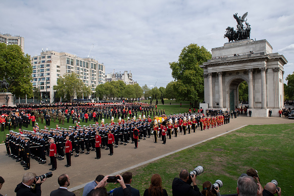 The coffin was taken from the Abbey and placed again on the state Gun Carriage. It was then wheeled through Parliament Square, to Horseguards Parade, before travelling down The Mall and around the Queen Victoria monument at the front of Buckingham Palace. It arrived at Wellington Arch where it was transferred to the State Hearse to be driven to Windsor Castle.