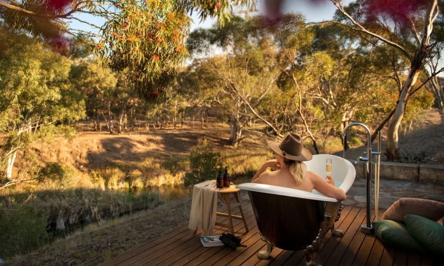 Experience an off-grid, eco-friendly tiny house nestled in scrubland scenery in Cabn X William. Launched in April 2021, the tiny house has darker materials and timbers that help to create a sense of cosiness. Sweat out city toxins in its private sauna, stargaze through the home’s glass ceiling or simply sit by its indoor fireplace with a bottle of organic Gemtree wine, with grapes sourced directly from the vines you’re surrounded by.