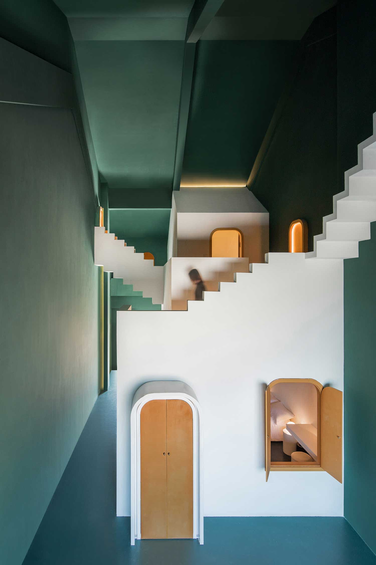 Architecture firmĀ Studio 10 is the brains behind this M.C. Escher-inspired staircase, which sits inside the Maze suite in The Other Place Hotel in Guilin, China.