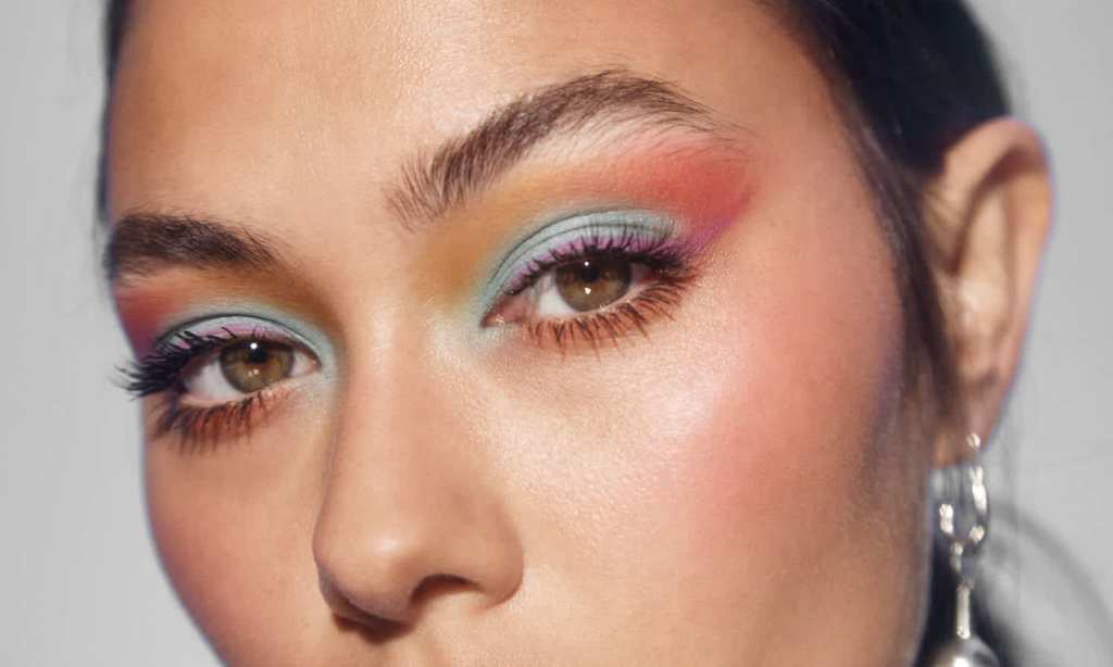 “Mecca Max Locking Eyes palette is your go-to for this trend so press on the blue with either your finger or a brush so you have maximum coverage on the lid,” Baumann said. “Take the yellow and contour through the inner crease till it hits the bridge of the nose then blend peach and raspberry together for the socket and extend outwards for a nod to the ’80s.