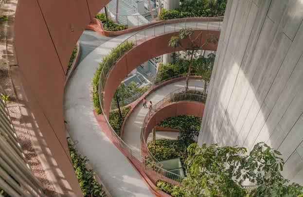 Image: CapitaSprings, a 51 storey building with a massive vertical garden occupying the 17-20th floors and a roof top urban farm.