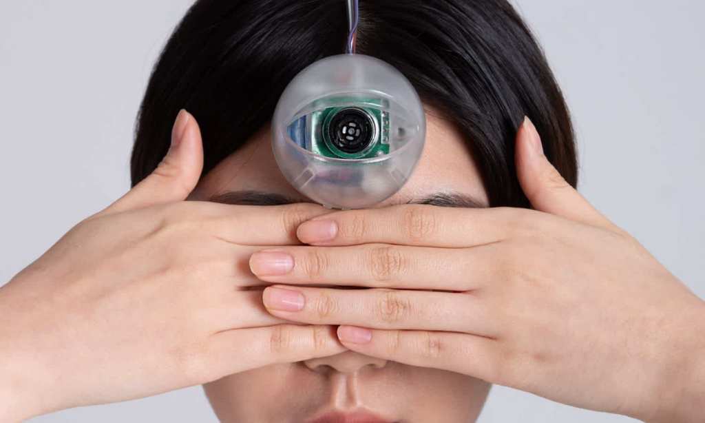 The Third Eye automatically opens its plastic eyelid when the head is tilted downwards, and sounds a warning buzz if a hazard is detected anywhere up to a metre ahead.
