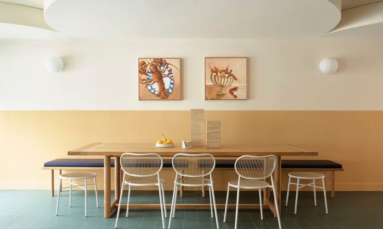 Those “interventions” lean into the 70s vibe with a warm palette of colours — ochre, ivory and kelp green — and materials, including oak feature walls and terrazzo bathroom trims. Commissioned artworks from Vynka Hallam hang in the suites and Pool House, as well as one piece from Tegan Franks.