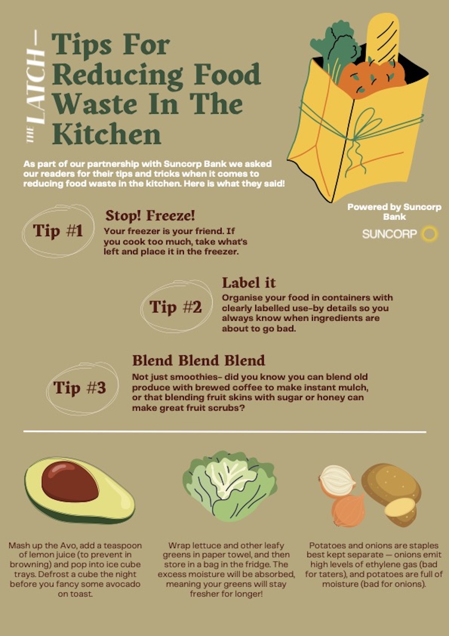 As part of our partnership with Suncorp Bank, we asked you all to give us some of your best tips and tricks to combating food waste in your own kitchen. Now, we’ve compiled our favourites in this quick and easy one-pager that you can save onto your device, or even print out and stick it on your fridge at home.
