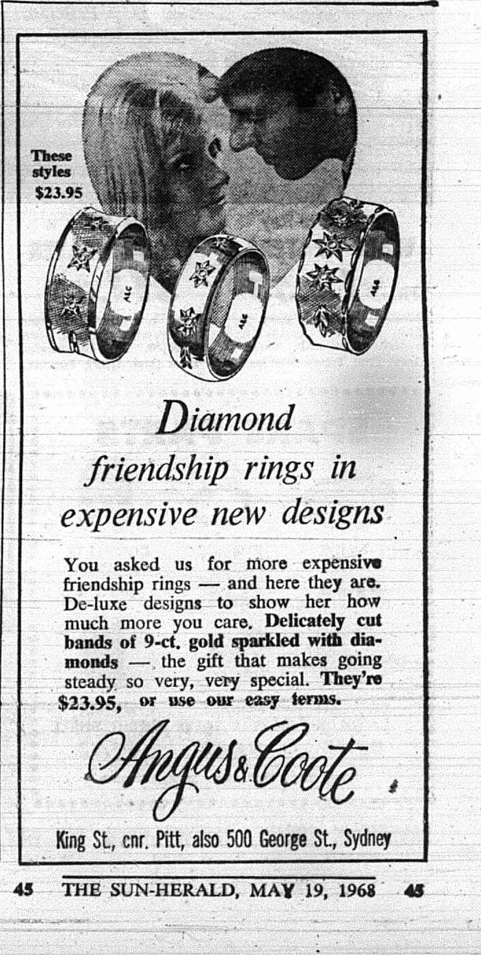 “Diamond friendship rings in expensive new designs,” said Angus and Coote.