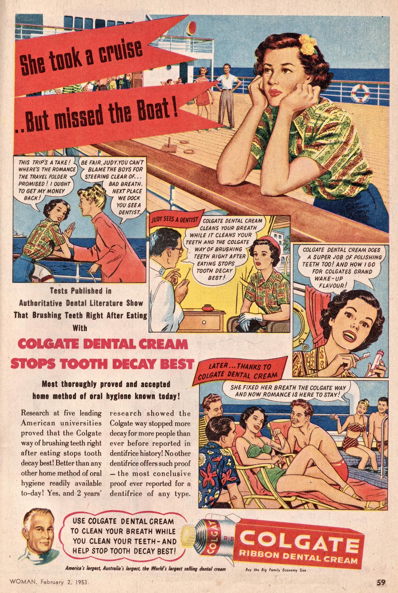 The year was 1953 and Colgate released a comic for the ages. In this ad, Colgate claim that the only way women will ever score romance is through brushing their teeth with Colgate toothpaste.