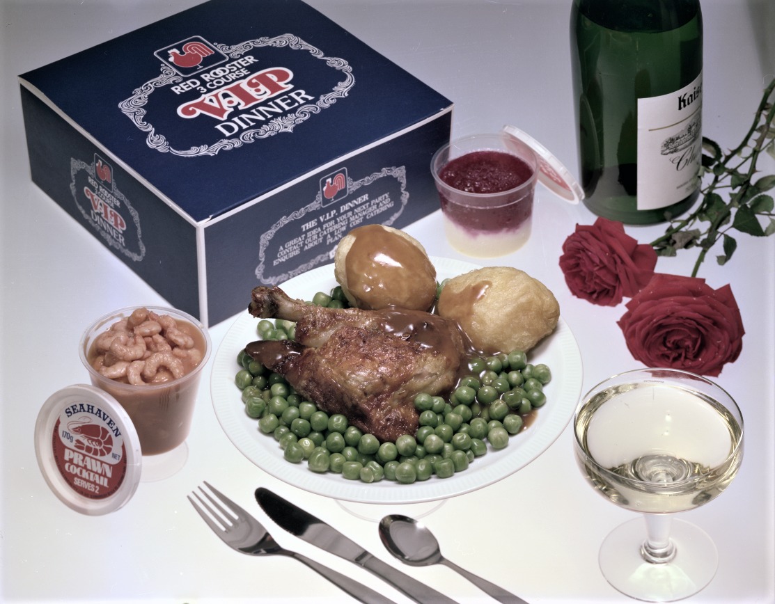 Okay folks, Red Rooster has entered the romance game and is playing to win. Because in 1977, they were hawking a bunch of gorgeous three-course VIP dinner boxes. These boxes came with a classic chicken piece, potatoes, and peas. They also came with a plastic container filled to the brim with prawn cocktail.