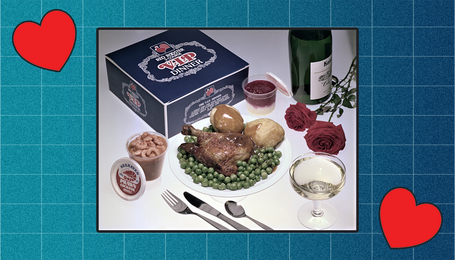 Okay folks, Red Rooster has entered the romance game and is playing to win. Because in 1977, they were hawking a bunch of gorgeous three-course VIP dinner boxes. These boxes came with a classic chicken piece, potatoes, and peas. They also came with a plastic container filled to the brim with prawn cocktail.